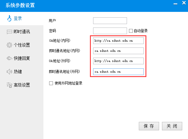 2、将“OA地址(内网)”、“即时通讯地址(内网)”、“OA地址(外网)”、“即时通讯地址(外网)”均设置为oa.sdust.edu.cn。点击保存,回到登录将界面,输入用户及密码即可。